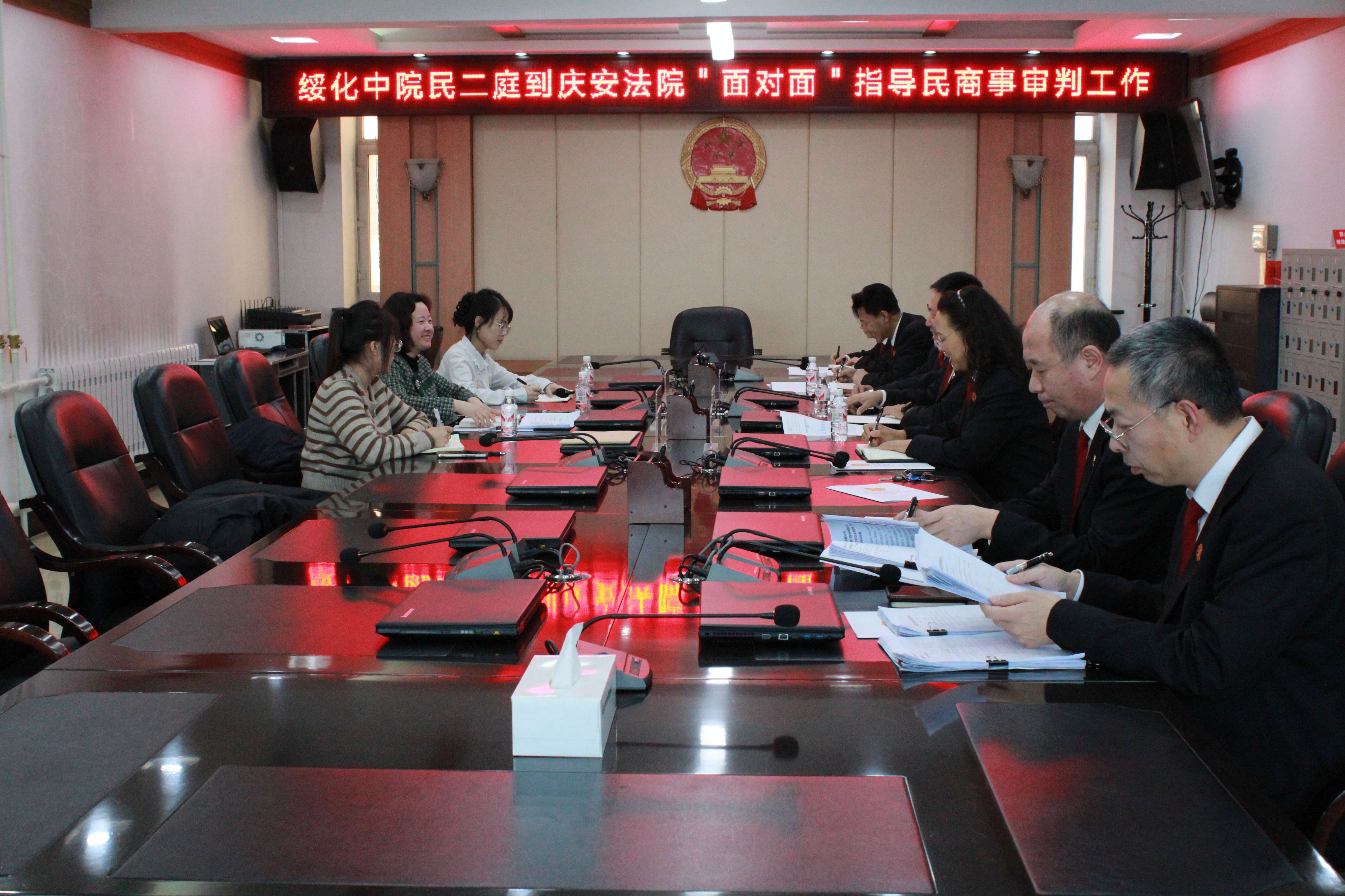 2月24日,绥化市中级人民法院民二庭庭长王春光一行三人到庆安县人民法院“面对面”调研指导条线工作。庆安法院党组书记、院长高玉阁,党组成员、副院长乔永艳,民庭庭长郝树长及民庭员额法官参加了会议。
