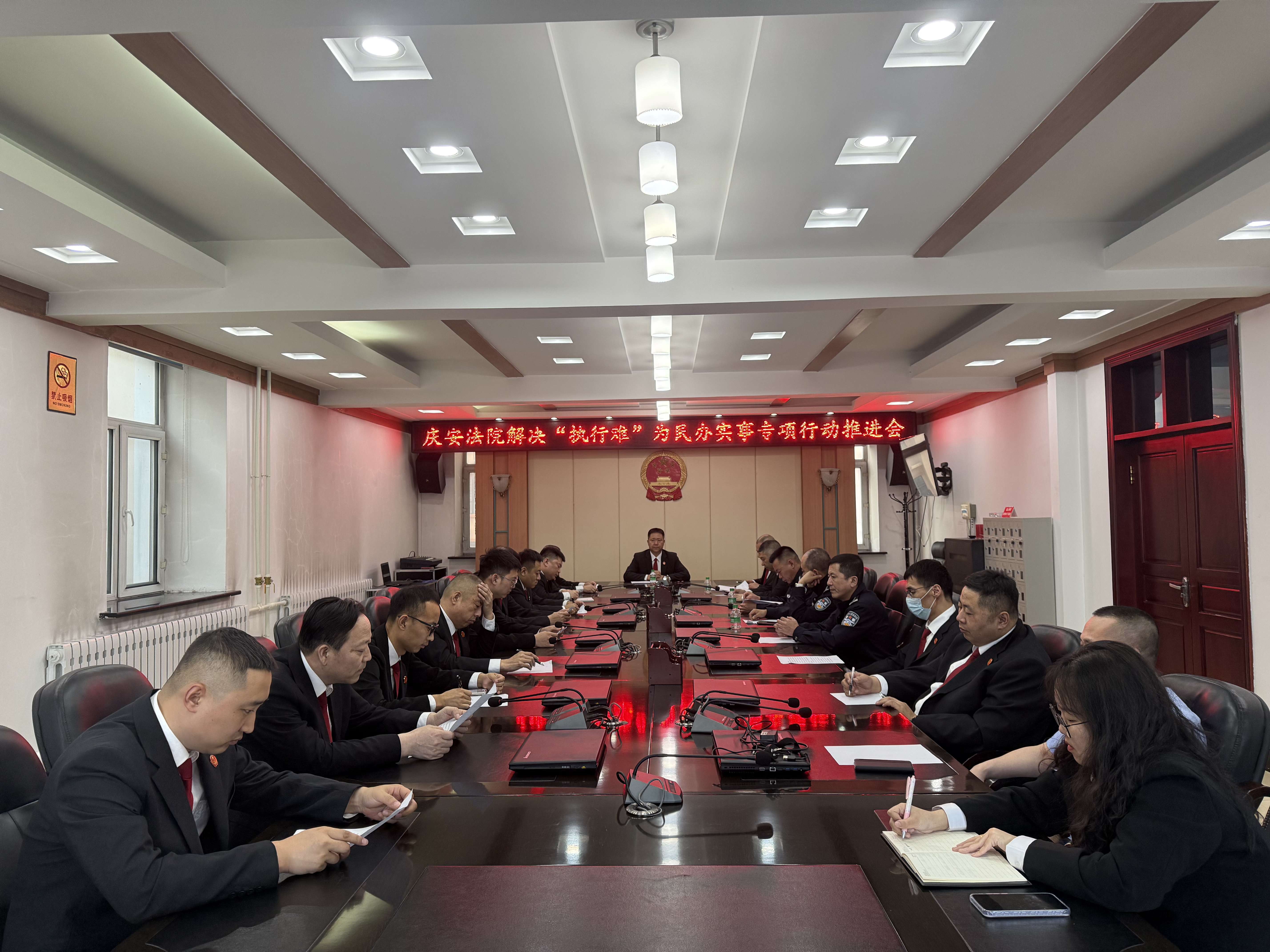 4月14日,庆安县人民法院召开会议落实绥化市中级人民法院开展解决“执行难”为民办实事专项行动部署工作会议精神,积极回应人民群众对司法工作的新期待、新要求。会议由党组成员、执行局局长张锐主持,党组书记、院长高玉阁出席会议并讲话,执行局全体干警参加了此次会议。