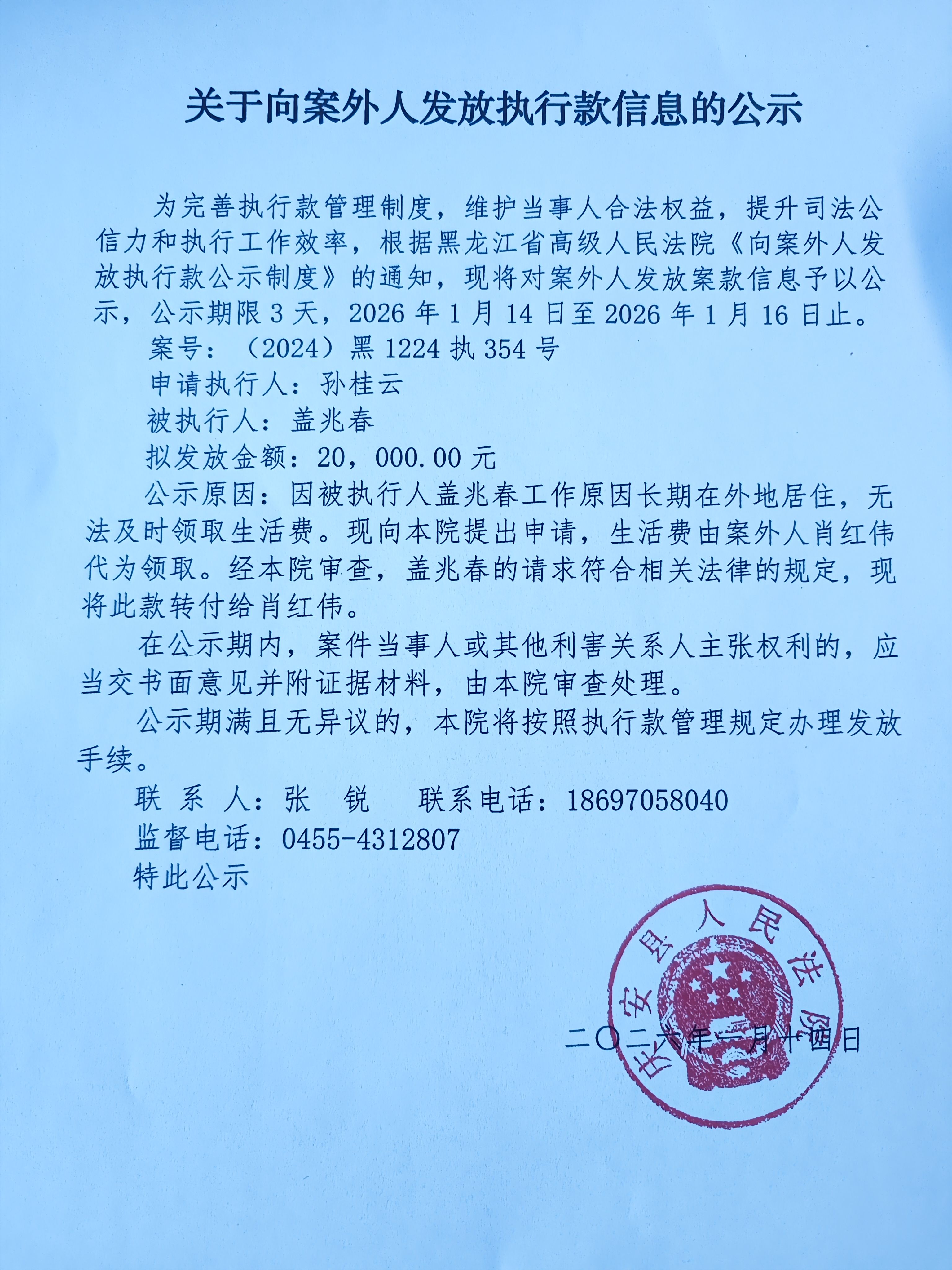 关于向案外人发放执行款信息的公示