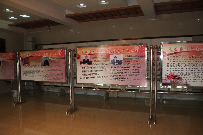 三是加强物质文化建设,营造法院文化环境。今年,该院加强了法院文化基础设施建设,努力将现代司法理念融于其中,实现了法院文化的物质化。象征公平正义的法院大楼文化景观,凸显了庄重、威严、简洁、宁静的法院文化特色,塑造体现了法院特殊文化内涵的物质环境,凸显了法院文化底蕴和公正精神,向社会公众彰显法院司法形象和法律尊严。在法庭内部设施建设和环境布置上,在法院正门大厅悬挂了电子显示屏,把法院各种活动显示给群众。在法院大楼各个走廊悬挂了警醒励志的法学格言、警言警句、匾额和反映法院工作理念的标识,文化作品等。