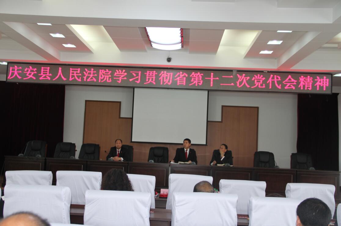 5月8日,庆安法院召开全院干警大会,认真学习全面贯彻省十二次党代会精神,王铁军院长要求,全院干警要进一步把思想和认识统一到省委书记张庆伟同志在省十二次党代会的报告精神上来;统一到省高院石时态院长和中院马国院长在落实会议精神的讲话中来,迅速掀起学习宣传贯彻省十二次党代会精神,要在年度工作中再部署,在推进措施上再细化,在具体工作中再推进。全院上下迅速形成思想大解放、行动更自觉、推进更有力的工作氛围。