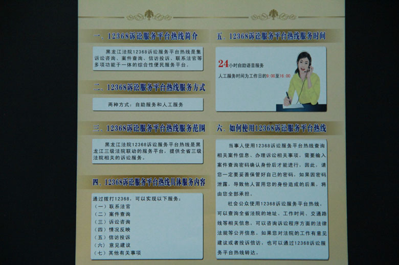 2015年6月30日庆安县人民法院运行开通黑龙江法院12368诉讼服务平台热线,群众有事足不出户就可以轻松得到相应的司法服务。庆安县人民法院通过制定《12368诉讼服务平台热线管理实施细则》、成立组织机构、配备座席人员、规范工作流程、强化监督管理,使热线服务进一步制度化、规范化,实现了“诉讼服务大厅、诉讼服务网、12368诉讼服务热线”三大平台的互联互通,从而形成诉讼服务的合力。