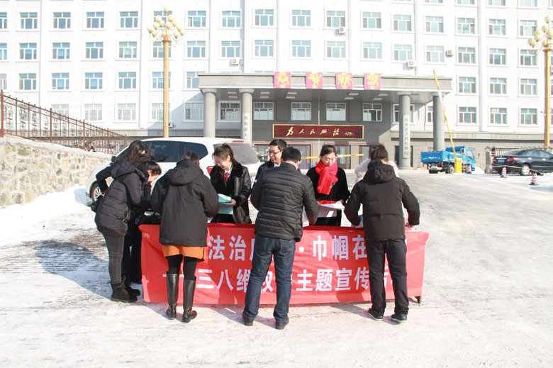 3月2日上午,庆安县人民法院会同县妇联共同开展了建设法治庆安、巾帼在行动——“三八”维权周主题宣传活动,在明媚的春光里为广大妇女送上一份节日的“法律大餐”。