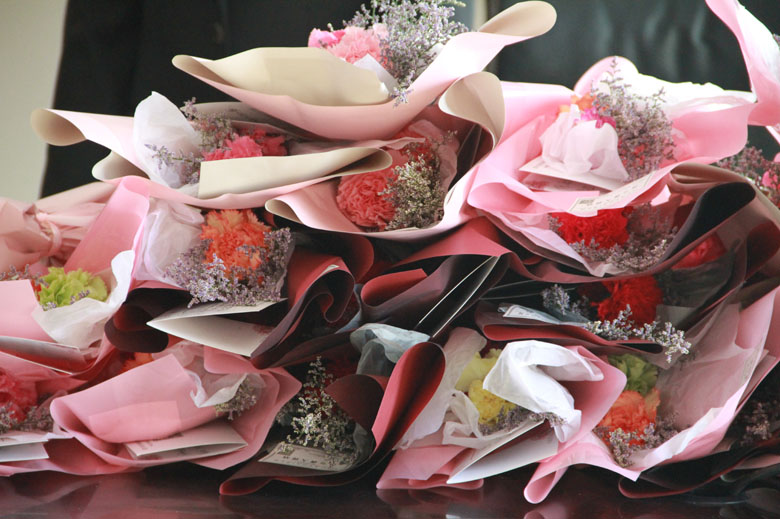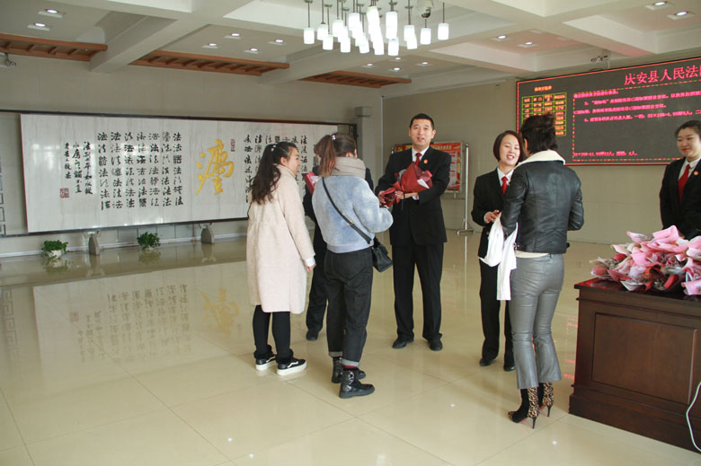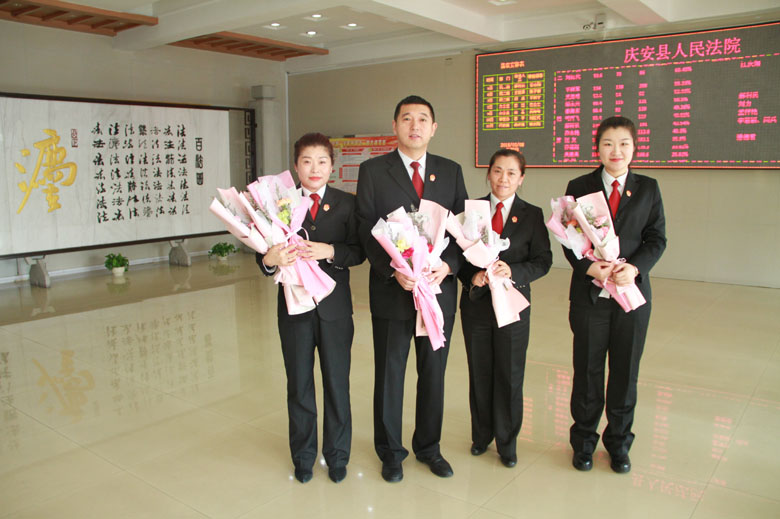 院党组向女干警敬献鲜花。3月8日,庆安法院的女干警们一进办公楼就收获了一份惊喜。院党组成员们分别向早晨上班的女干警敬献鲜花。花束中都有一张精致的卡片,由党组成员亲笔写下祝福,表达着院党组对全体女干警的美好祝愿和期许。女干警们在惊喜之余都被院党组的细心所深深感动,纷纷表示在今后的工作中要加强学习,提升能力,争取作出更多的成绩,展现巾帼风采。
