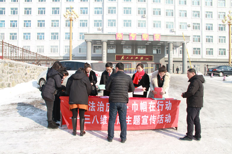 妇女维权宣传活动。3月2日上午,庆安法院会同县妇联共同开展了建设法治庆安、巾帼在行动——“三八”维权周主题宣传活动,通过设置宣传台现场进行释法答疑、发放宣传单等形式,在明媚的春光里为广大妇女送上一份节日的“法律大餐”。
