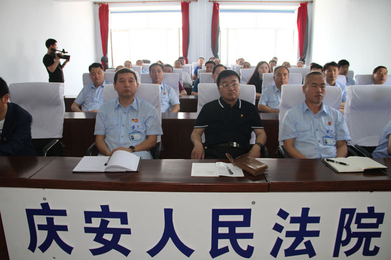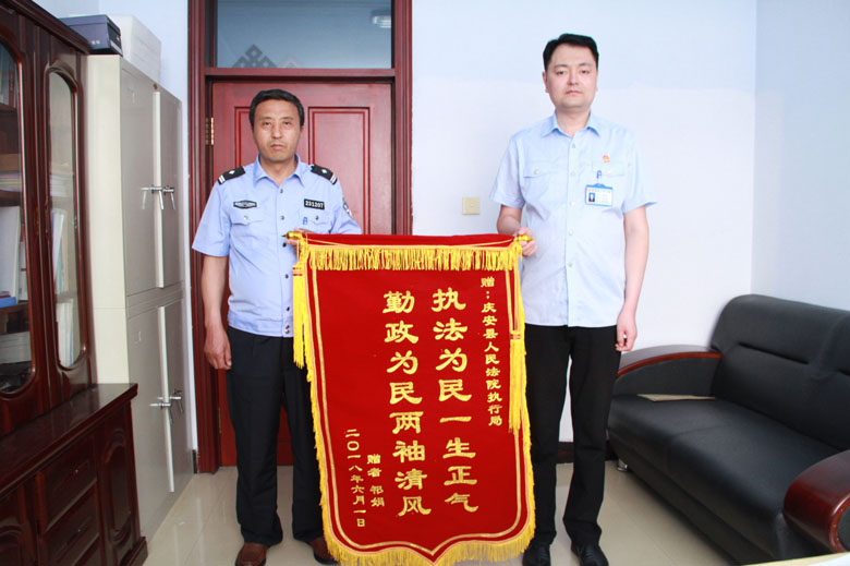5月31日,庆安法院党组成员、执行干警和县相关职能部门负责人一同收看了全省“雷霆行动”决战决胜基本解决执行难誓师动员大会视频,誓师结束后,成立了以党组书记、院长王铁军为总指挥的“雷霆行动”攻坚领导小组,集中统一指挥。6月1日上午,“雷霆行动”正式启动。下午,申请执行人祁某满怀对法官的感激之情来到法院,献上一面题为“执法为民,一身正气,勤政为民,两袖清风”的锦旗。简短的16个字,包含了对司法的敬畏,对法官的敬仰,肯定了执行法官和广大群众的雨水之情。