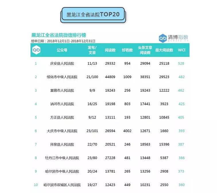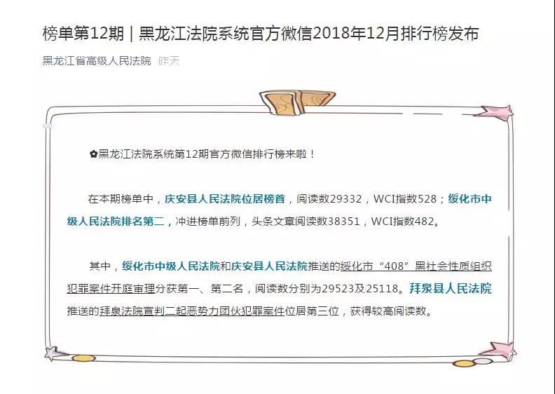 1月22日,黑龙江法院系统官方微信2018年12月排行榜发布,绥化中院、庆安法院冲进榜单前三名。绥化市中级人民法院文章阅读数38351,WCI指数482;庆安县人民法院文章阅读数29332,WCI指数528。