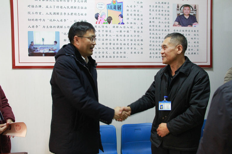 庞洪峰听取了庆安法院关于诉调对接工作的情况汇报,亲切慰问了“说和人老李”—人民调解员李玉君同志,并深入了解了调解工作情况,同时与随同人员一起观看了庆安法院《诉调对接开新篇 多元化解结硕果》诉调对接工作专题片。